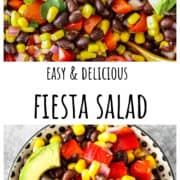 My fiesta salad recipe is a colorful salad bursting with fresh flavors! Mexican food fans will love the mix of sweet corn, black beans, creamy avocado, and fresh vegetables. This black bean salad is loaded with crisp red pepper, juicy tomatoes, and red onion tossed in a zesty lime dressing. The corn adds just the right amount of sweetness, while avocado brings in those healthy fats that make this dish satisfying and nutritious.