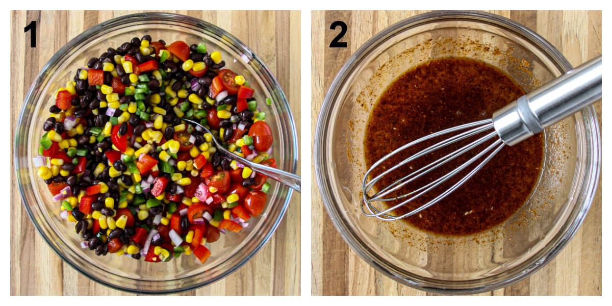 - In a large mixing bowl, combine black beans, corn, tomatoes, bell pepper, jalapeno, and red onion.