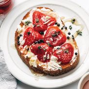 Unexpectedly delightful little pops of sweet vinegar-soaked strawberries on grilled sourdough with goat cheese, thyme, and honey!