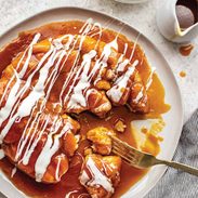 3. Assemble: Pour most of the pumpkin caramel over the biscuits until mostly covered. Set aside the remaining 1/4 to 1/2 cup caramel for topping.