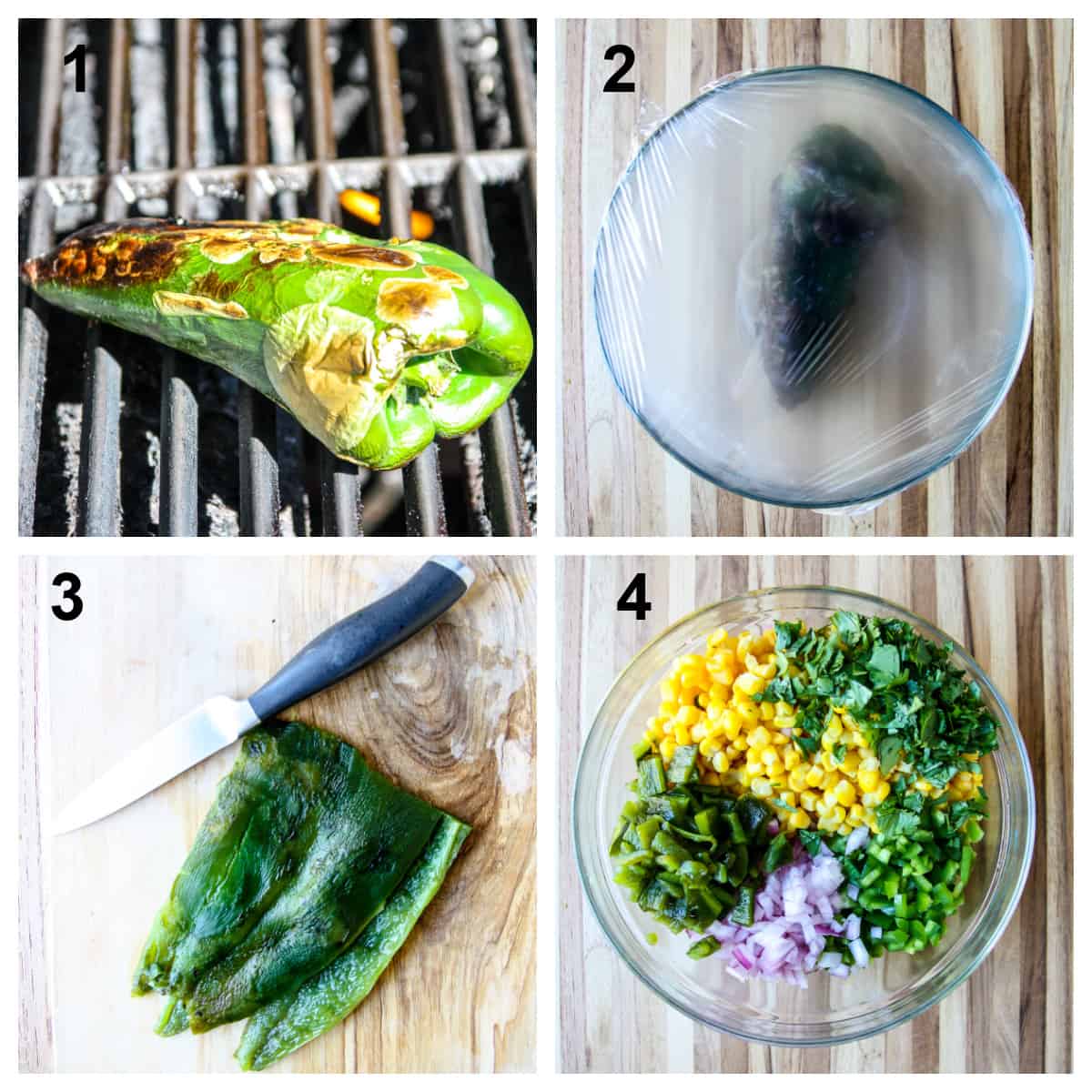 Pre heat the grill to high or 400% Put the poblano pepper over direct heat on the grill. Keep turning until the skin is blistered and blackened on all sides.