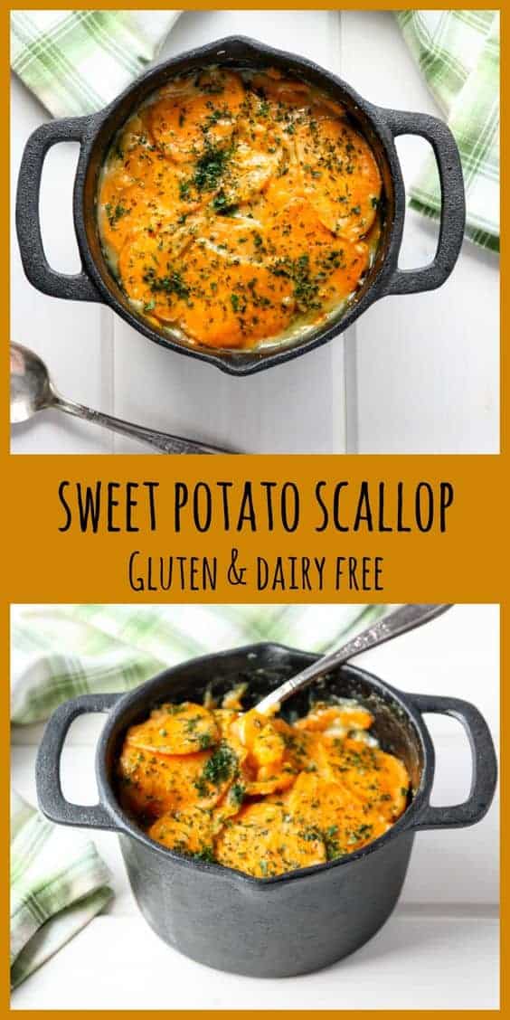 The sweet potatoes and the onions in this recipe, bake up into a deliciously creamy, garlic and rosemary-infused coconut broth, which thickens up and turns this dish into pure delicious. It's a very different dish than a regular potato scallop, but, just as good.